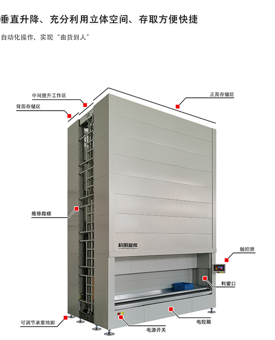 货柜主体结构采用国标冷轧钢板加工,由八个支撑立柱、两侧连接横梁组成,立柱为承载骨架,提供主要承力。托盘矩阵式组合结构存放于货柜内部正面和背面卡槽上。整机在最大负载或不均匀负载长时间运转下具有足够的刚性,不变形。设备设计制造符合国家的有关安全要求及环境标准。